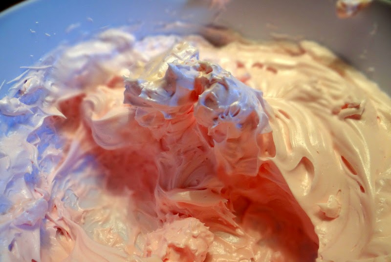 Die Mandeln mit dem Puderzucker gut mischen und in eine Schüssel sieben. Eiweiß mit einer Prise Salz steif schlagen. (Tipp: Das Eiweiß bereits 1-2 Tage vorher vom Eigelb trennen und im Kühlschrank aufbewahren. Dabei verliert es an Flüssigkeit, was den Macarons später eine bessere Standfestigkeit verschafft.) Sobald der Eischnee etwas anzieht, den Kristallzucker und nach Belieben die Lebensmittelfarbe hineingeben. Ich habe rote Farbe verwendet, um hübsche zart rosafarbene Macarons zu bekommen. Alles so lange miteinander verschlagen, bis eine kompakte Masse entsteht. Das kann ein paar Minütchen dauern.