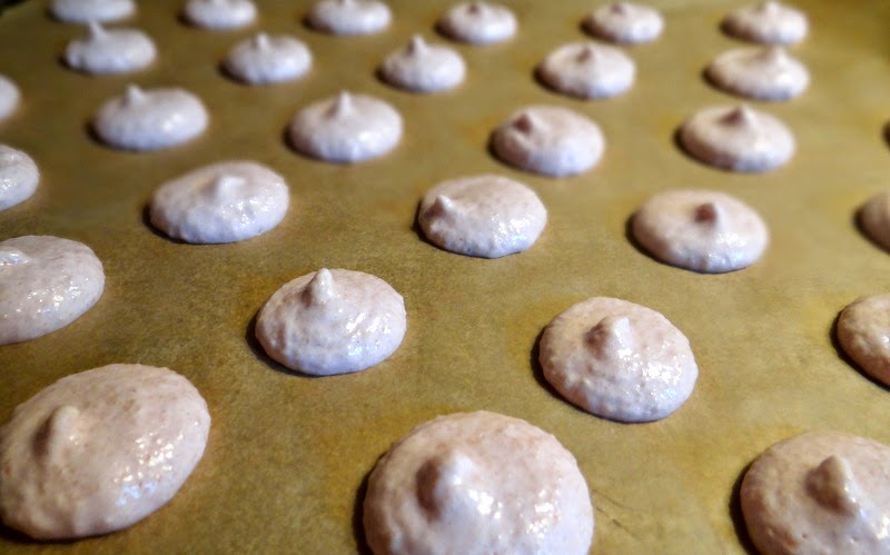 Die Mandel-Puderzucker-Mischung in zwei Etappen vorsichtig unterheben, bis alles schön glänzt. Die Masse in einen Spritzbeutel füllen. Ersatzweise kann auch ein Gefrierbeutel verwendet werden. Einfach eine der unteren Ecken abschneiden. Fertig. Funktioniert wunderbar. Nun kleine Kleckse auf ein mit Backpapier ausgelegtes Backblech spritzen. Um überschüssige Luft aus den Macarons heraus zu bekommen, ein paar Mal mit der flachen Hand unter das Blech schlagen. Das führt im Idealfall dazu, dass die kleinen Zipfel spätestens beim Backen verschwinden. Das Blech nun zur Seite stellen und die Macarons eine gute Stunde trocknen lassen. Im Anschluss bei 130 °C etwa 15 Minuten im vorgeheizten Backofen backen.