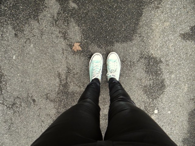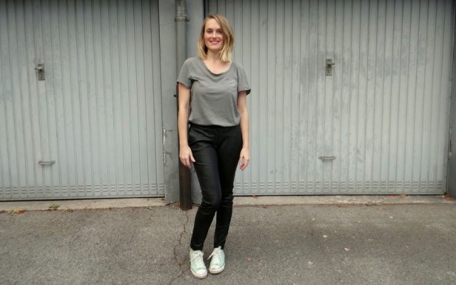 Lederhose: Mango / T-Shirt: Levis / Schuhe: Converse