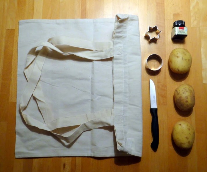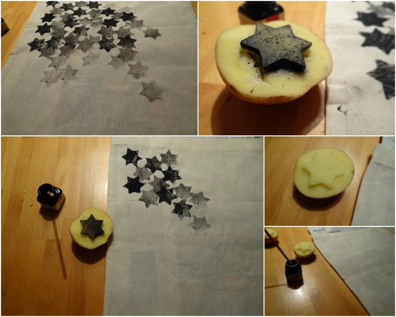 Als erstes sollte man zwischen die beiden Stofflagen etwas Zeitungspapier legen, da sich die Farbe (je nach Intensität des Farbauftrags) durchdrückt. Und dann geht es auch schon damit los, den Stempel zu präparieren. Dafür etwa 1/3 einer Kartoffel abschneiden und das gewünschte Förmchen fest auf der glatten Schnittfläche eindrücken. Die überschüssigen Ränder im Anschluss vorsichtig ca. 1/2 cm dick mit einem kleinen Messer abschneiden, so dass das Motiv zum Vorschein kommt. Voilà! Und fertig ist der Stempel.