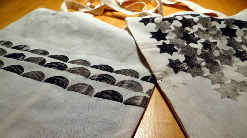 Nun die Farbe mit dem Pinsel auftragen und die bepinselte Fläche auf den Stoff drücken. Das Ganze so häufig wiederholen, bis das gewünschte Ergebnis erreicht ist. Was Farbe, Formen etc. betreffen, sind der Phantasie keine Grenzen gesetzt. Man kann Sprüche, Namen, Herzchen oder was auch immer drauf drucken. Einfach machen und ausprobieren. Ich habe mich für Sterne und Halbmonde entschieden, da diese Motive meiner Meinung nach immer gehen. (Zu den Halbmonden hat mich ein Design von Ferm living inspiriert.)