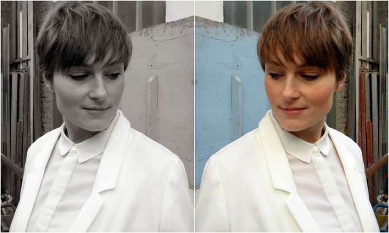 Wenn man einen Blog schreibt, der sich vornehmlich mit Mode und den eigenen Outfits beschäftigt, kann man in der Tat vieles über sich lernen. Bislang habe ich immer gedacht, ich müsste mich ständig über ein ziemlich beachtliches Defizit an Hemden beklagen, welches ich natürlich bei jeder (Shopping)Gelegenheit auszubessern gewillt war. Fakt ist, ich habe ne Menge Hemden und ich trage sie häufig. Es ist doch verflixt, wie einen die eigene Wahrnehmung täuschen kann. Aber nun gut. Zweite Erkenntnis: Mit Hemd bzw. Bluse fühle ich mich immer gut angezogen. Dazu noch einen Pulli, Blazer oder ein Jäckchen und meine Alltagsuniform ist perfekt. Darüber hinaus habe ich eine eindeutige Schwäche für scharz-weiß Kombinationen, wie dieses Outfit nur zu gut bestätigt. Den Blazer habe ich übrigens bereits vor etlichen Monaten in einem Secondhand-Laden in Berlin erstanden, und ganz ehrlich gesagt, noch nie getragen. Aber jedes Kleidungsstücke hat eben seine Zeit (Erkenntnis Nummer 4). Als nämlich vor wenigen Tagen diese Hose bei mir einzog, war sofort klar, das dieser Blazer geradezu für sie geschaffen ist. Et voilà!