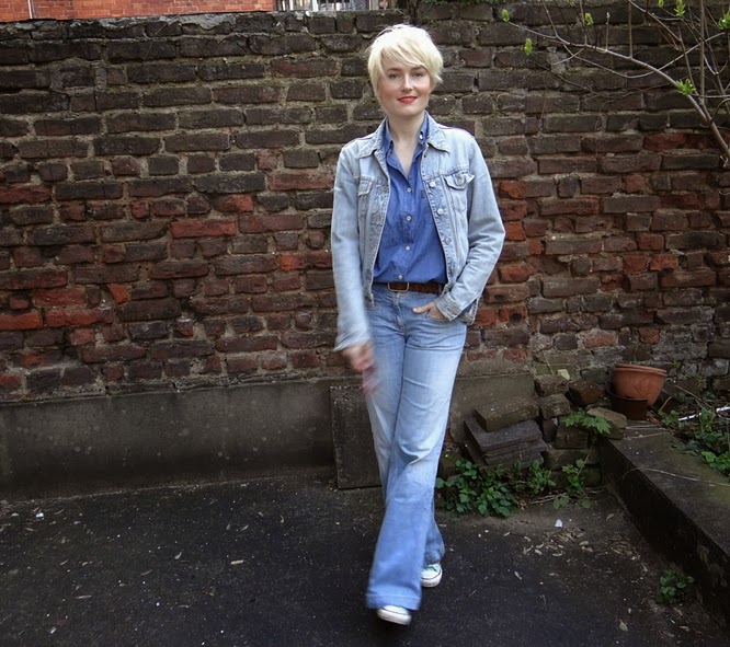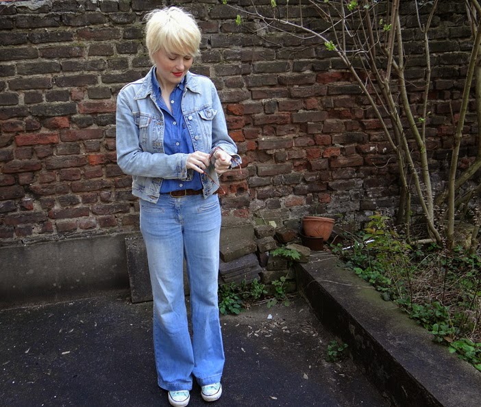 Letztlich kann ich nicht genau sagen, woran es liegt. Doch die derzeitige Tendenz ist unverkennbar. Ich neige immer mehr dazu, meine Kleidungsstücke farblich auf einander abzustimmen, wie ihr hier schon zu sehen bekommen habt. Klar ist, der 70er Trend hat unlängst Einzug gehalten in unsere Kleiderschränke. Oder anders gesagt: Die darin schlummernden Schätze erleben ein großes Revival. Somit erklärt sich die Schlaghose hier mehr oder weniger von selbst. Aber von Kopf bis Fuß in Jeans hätte ich mich noch vor gar nicht allzu langer Zeit überhaupt nicht gesehen. Doch wie läuft es nur zu häufig? Die verrücktesten Kombinationen, die man sich an einem Tag so gar nicht vorstellen kann, findet man am nächsten Tag schon ganz passabel, um sie am dritten Tag für absolut großartig zu halten. Man sollte also niemals nie sagen. Ganz besonders in Sachen Mode. Außer vielleicht zu weißen Stiefeln. Aber wer weiß…