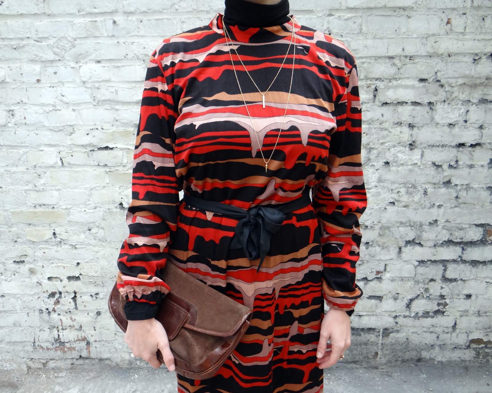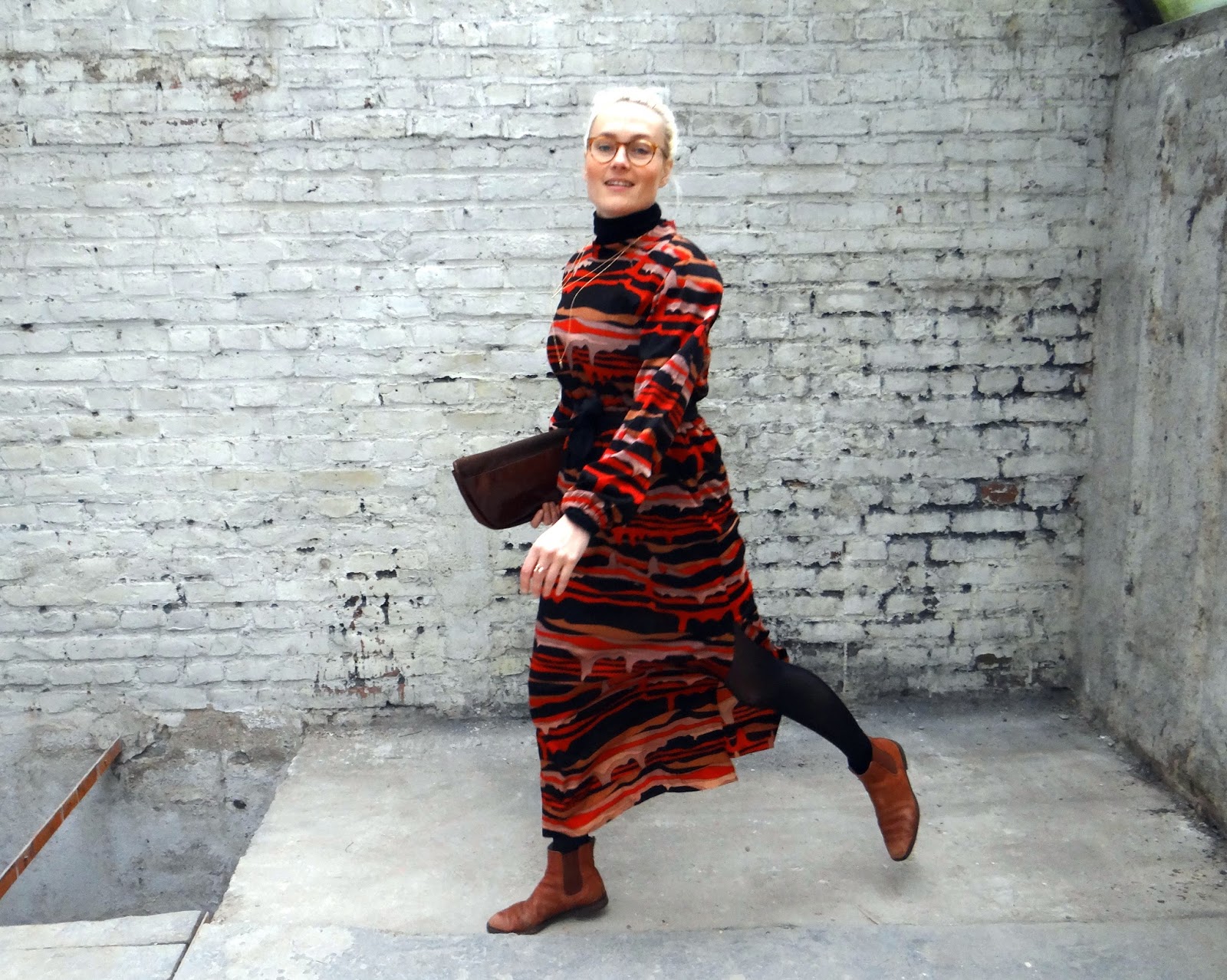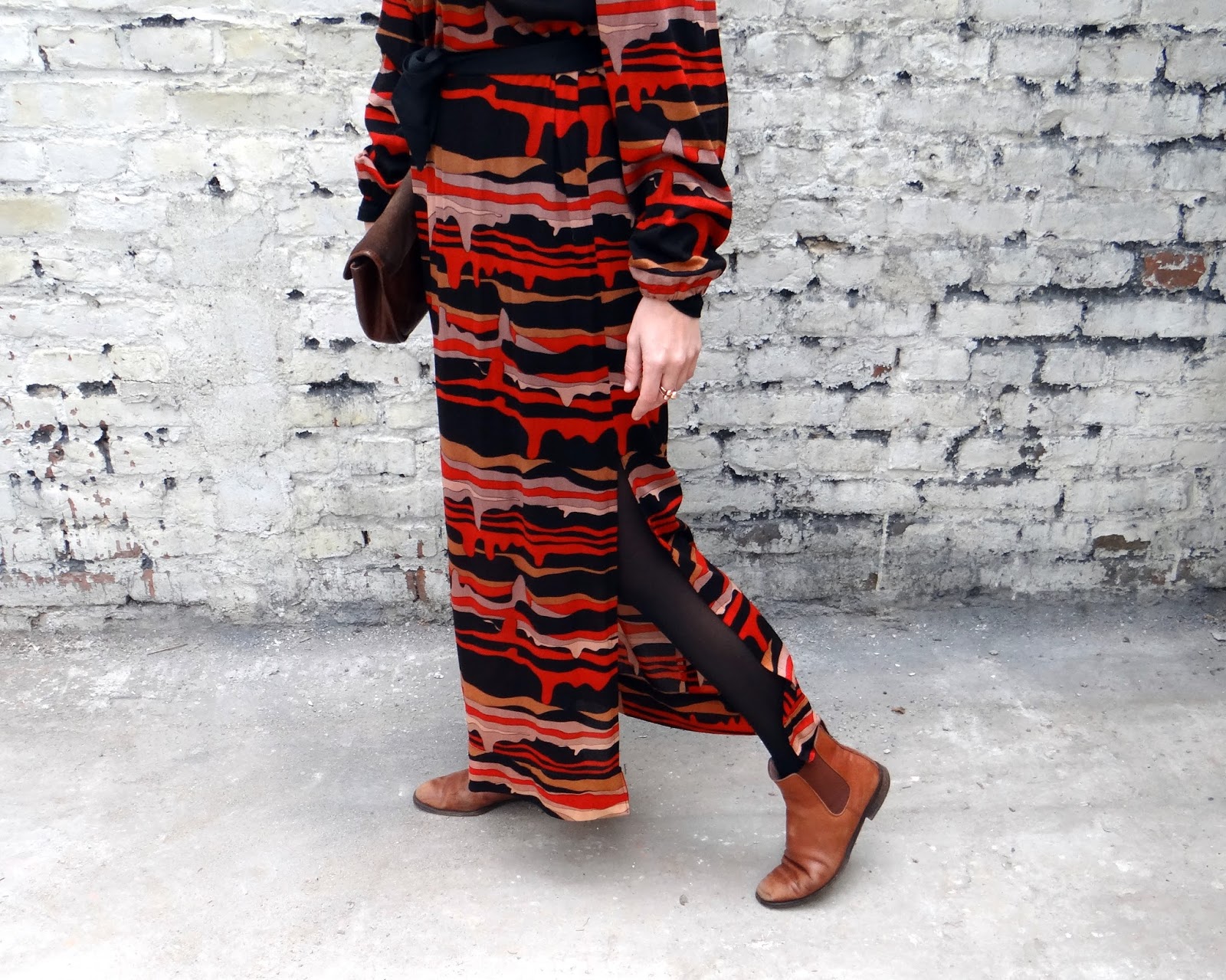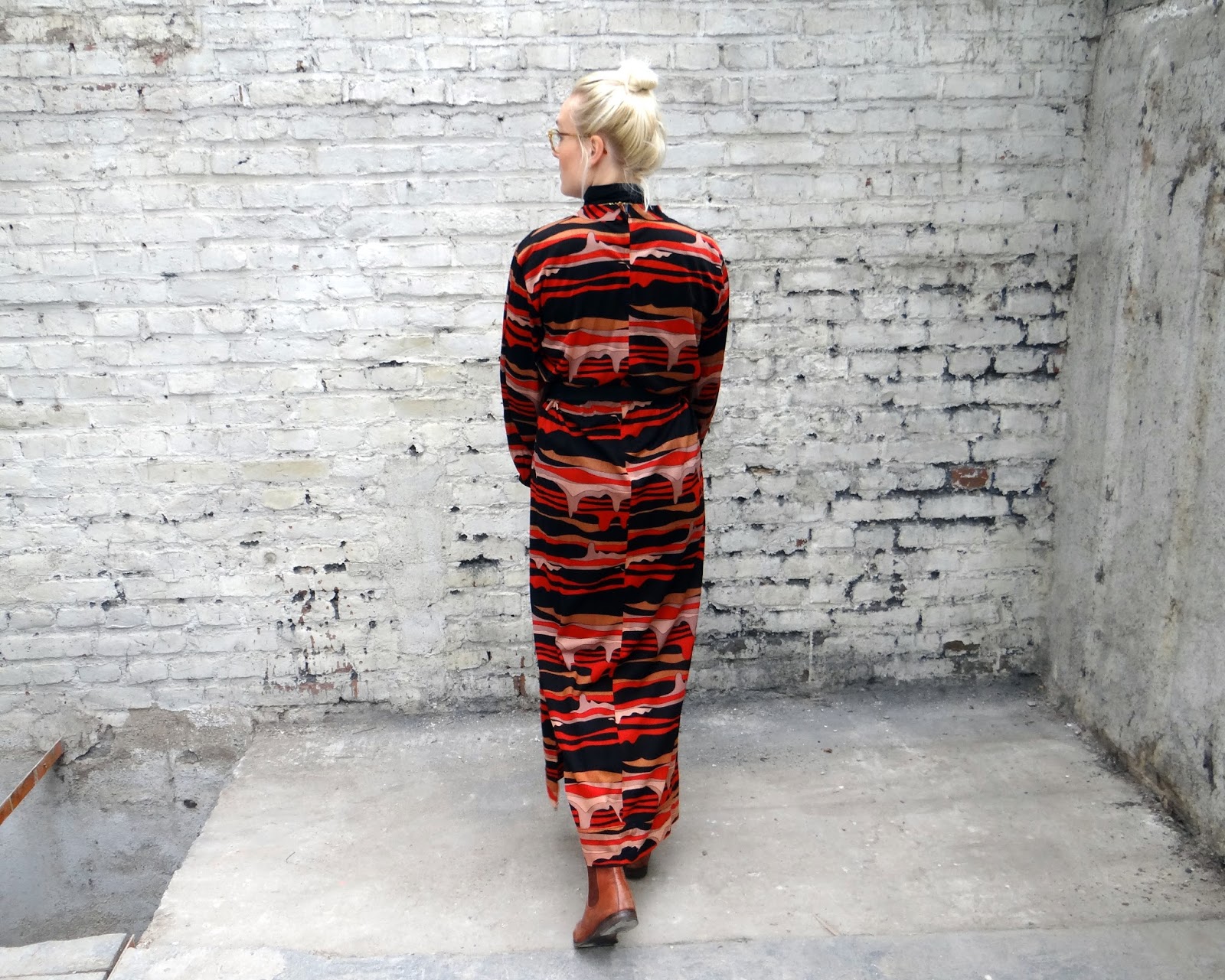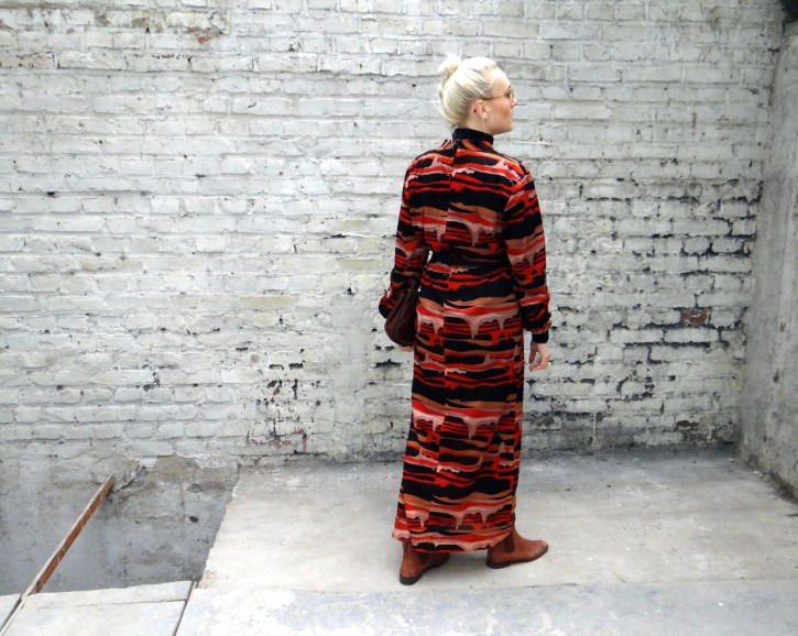 Ich weiß, ziemlich 60er. Aber mir gefällt’s. Und ganz dem Trend vergangener Tage geschuldet, zu 100% aus Polyester. Aber was soll’s drum. Bei diesen frostigen Temperaturen kommt bestimmt keiner ins Schwitzen. Auch nicht im Plastik-Dress. An dieser Stelle ist also geklärt, dass sich dieses Kleid nicht durch seine Qualität auszeichnet. (Wobei ich erwähnen möchte, dass es sich hierbei, auch wenn aus 2. Hand geshoppt, um ein selbst genähtes Modell handelt. Die säuberlichen Nähte lassen daran keinen Zweifel.) Es sind also Schnitt und Muster, wodurch dieses Maxikleid besticht und im Handumdrehen zum Traum meiner schlaflosen Nächte wurde.