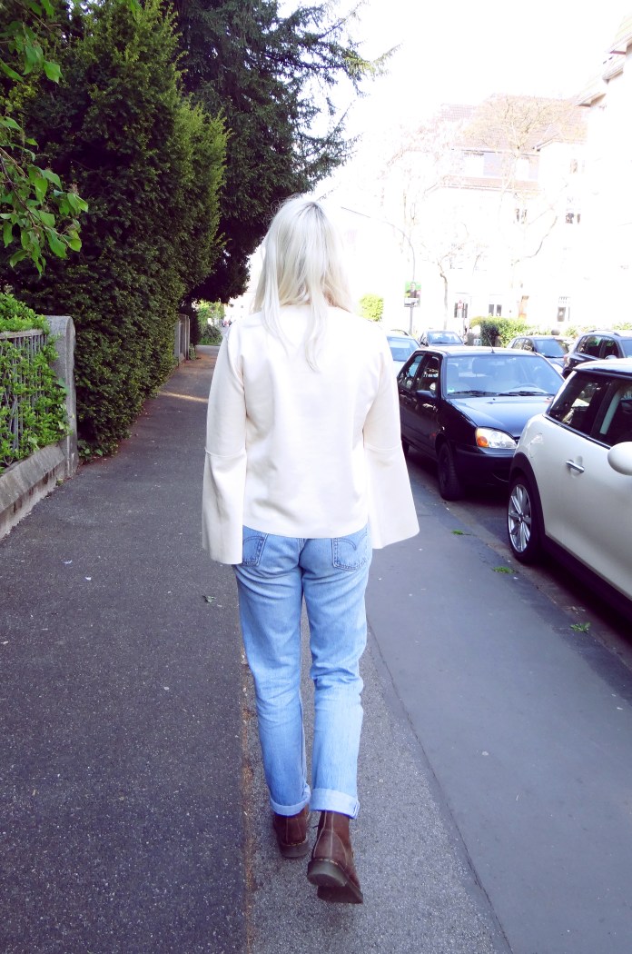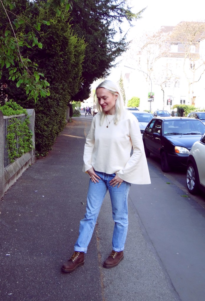 Nun zu meinem Outfit: Trompetenärmel aka Statement Sleeves sind sicherlich nicht der aller neueste Schrei, aber dennoch präsenter denn je. Und nach einigen Anlaufschwierigkeiten bin ich mittlerweile schwer angetan. Man bedenke hierbei nur: Damit lässt sich weder elegant essen, noch eben mal schnell die Spülmaschine einräumen oder gar unfallfrei über den Tisch greifen, wenn sich auf diesem Getränke oder brennende Kerzen befinden. Diese Dinger sind IMMER im Weg. Aber was soll? Sie sind einfach schön! Dazu trage ich zwei wahre Klassiker – Dr. Martens Boots und eine original Levis 501 – beides Anfang des Jahres Vintage in einem wunderbaren Secondhandladen im wunderbaren Antwerpen geshoppt.
