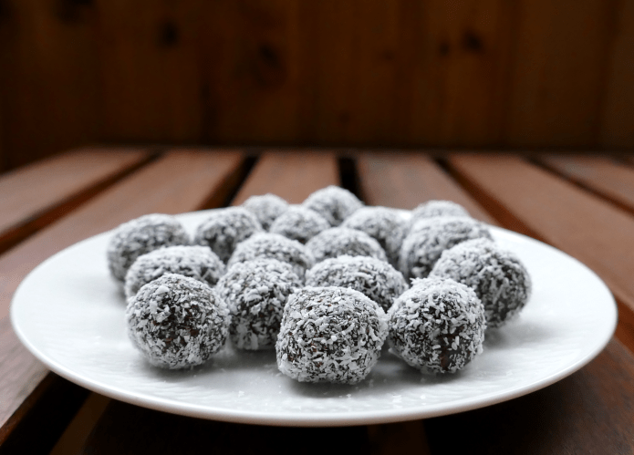Das war’s. Die Datteln mit einem beliebigen elektronischen Gerät zu einem Mus verarbeiten. Ich verwende dafür einen Stabmixer. Hierbei bitte nicht entmutigen lassen. Das ist durchaus mühselig. Doch durchhalten lohnt sich. An dieser Stelle gebe ich auch schon das erwärmte, sprich flüssige, Kokosöl hinzu, weil ich mir einbilde, dass es dann minimal besser klappt. Im Anschluss die restlichen Zutaten unterrühren – etwa 1 EL der Kokosraspeln beiseite stellen – bis sich alles zu einer knetbaren Masse zusammengefügt hat. Nun mit den Händen kleine Kugeln formen und diese in den übrigen Kokosraspeln wälzen. Fertig. Am besten schmecken mir die Dattel-Schoko-Kokos-Kugeln gekühlt aus dem Kühlschrank. Bon Appetit!