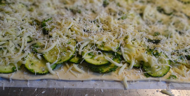 Zucchinischeiben, Zitronenschale, Petersilie, Thymian, Knoblauch und Olivenöl in einer Schüssel mischen. Zuerst die Hälfte des Mozzarellas und des Parmesan, dann die Zucchinimischung gleichmäßig auf dem Pizzaboden verteilen. Restlichen Mozzarella und Parmesan darübergeben, mit Salz und Pfeffer würzen und mit noch etwas Olivenöl beträufeln. 15-20 Minuten backen, bis der Teig knusprig und der Belag goldbraun ist. BON APPETIT!